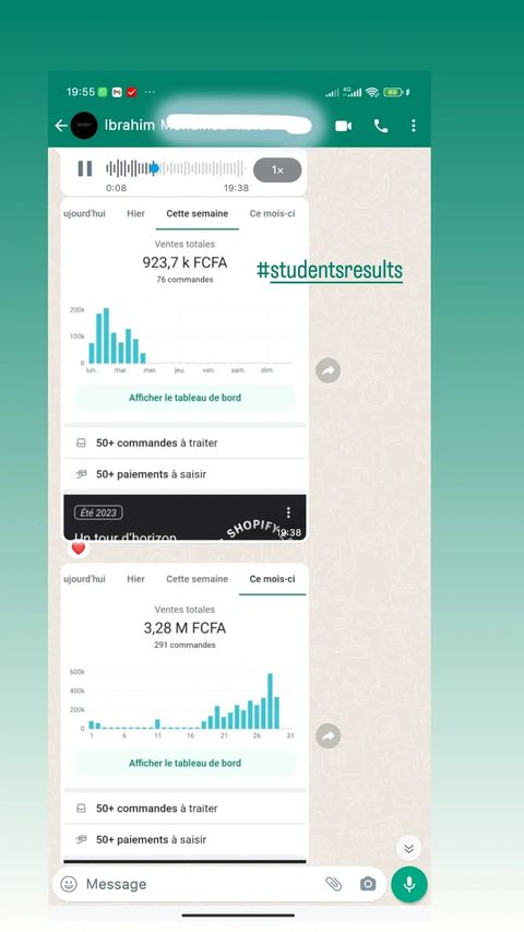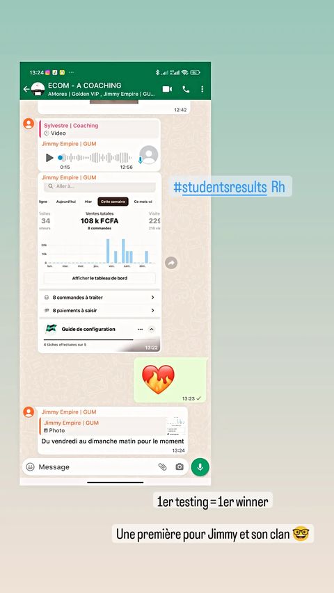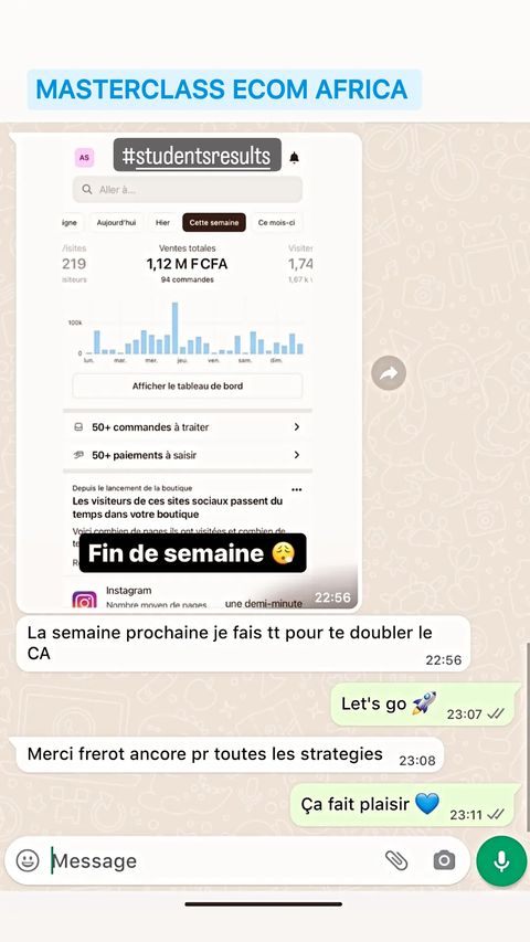 Avertissement : Il est important de comprendre que les résultats mentionnés ici sont atypiques et ne garantissent en aucun cas que vous obtiendrez les mêmes succès. Ces témoignages reflètent les expériences individuelles de ces utilisateurs et ne sont pas représentatifs de tous les utilisateurs du programme ECOM AFRICA ELITE. Le succès en E-commerce, comme dans n'importe quel domaine d'entreprise, requiert du dévouement, du travail, de la connaissance, et divers facteurs personnels et professionnels.