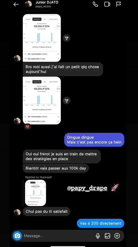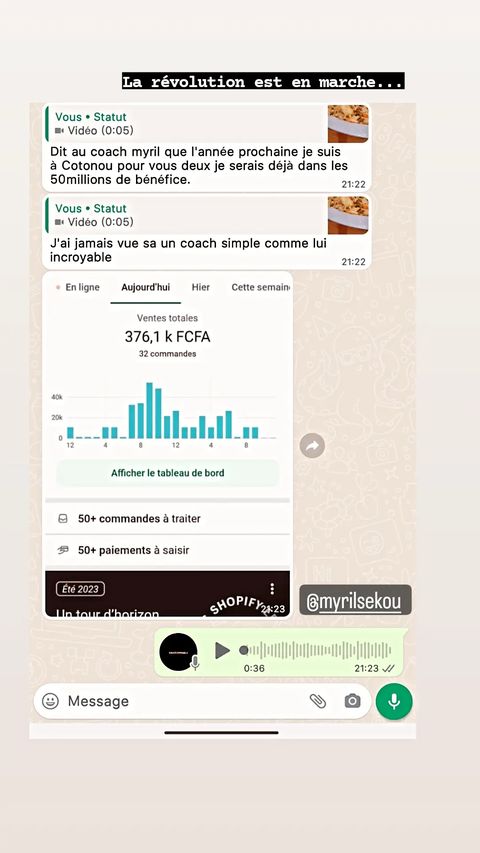 Perdu au départ, je me suis plongé dans des recherches fiévreuses pour percer le secret d’une richesse rapide. C’est là que j’ai découvert le dropshipping et j'ai eu le capital nécessaire. Enfin j'ai rencontré Myril SEKOU qui m'as donné un coaching digne du nom et j'ai réalisé plus de 100M de CA. Pour ma famille, pour moi, je me suis senti investi de cette mission vitale, celle de briser ce cycle d’adversité. Le travail est devenu ma seule obsession, mes nuits, hantées par les rêves inachevés, ne m’accordaient aucun repos.